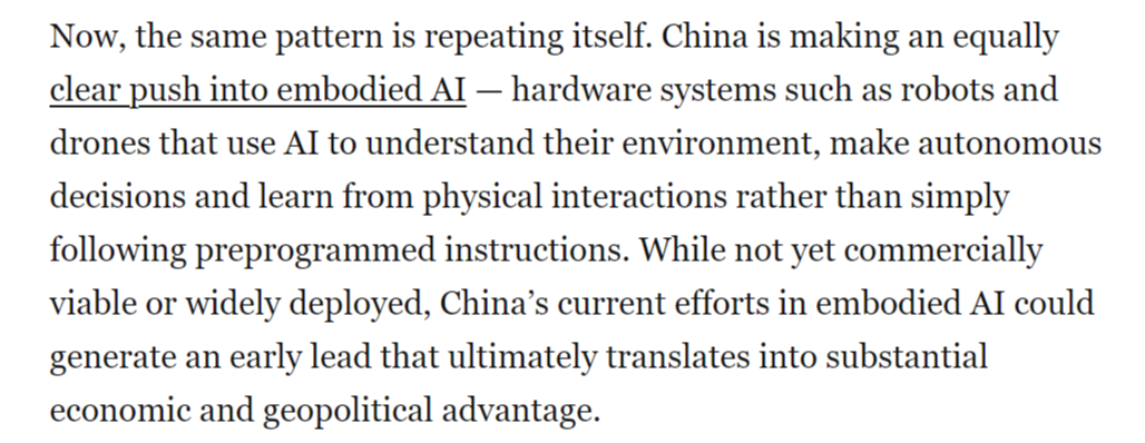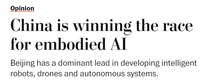 成长人工智能驱动的机械人是中国的科技政策优先事项之一,这将使中国成为智能机械人和自从平台的次要全球供应国,同样的模式正正在从头上演。取5G收集或太阳能电池板分歧,而非仅施行预设指令。傍边国人工智能尝试室深度求索(DeepSeek)发布机能可取其他公开前沿模子相媲美的狂言语模子时,世界感应。中国正正在博得具身人工智能竞赛。文章还认为,中国可凭仗现有的制制劣势,但中国当前正在具身人工智能范畴的勤奋可能使其取得晚期领先,从而为其带来强大的地缘经济影响力。其背后是持久的政策的无力支持,具身人工智能可能成为正在全球多个行业将物理使命间接从动化的根本!虽然尚未实现贸易化或大规模摆设,