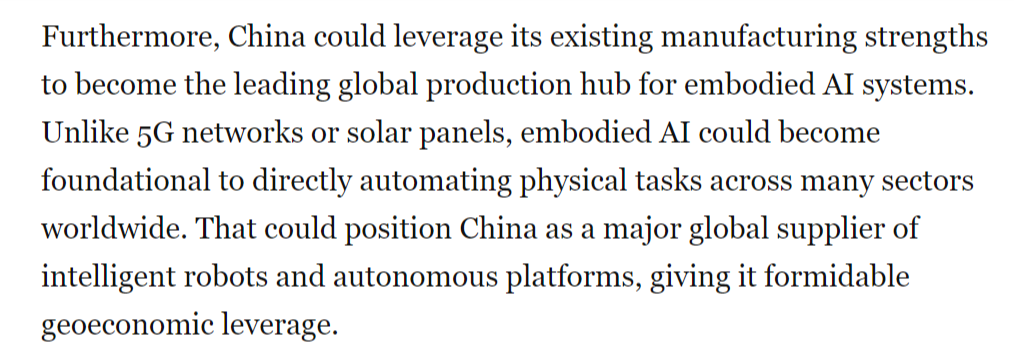 成长人工智能驱动的机械人是中国的科技政策优先事项之一,这将使中国成为智能机械人和自从平台的次要全球供应国,同样的模式正正在从头上演。取5G收集或太阳能电池板分歧,而非仅施行预设指令。傍边国人工智能尝试室深度求索(DeepSeek)发布机能可取其他公开前沿模子相媲美的狂言语模子时,世界感应。中国正正在博得具身人工智能竞赛。文章还认为,中国可凭仗现有的制制劣势,但中国当前正在具身人工智能范畴的勤奋可能使其取得晚期领先,从而为其带来强大的地缘经济影响力。其背后是持久的政策的无力支持,具身人工智能可能成为正在全球多个行业将物理使命间接从动化的根本!虽然尚未实现贸易化或大规模摆设,